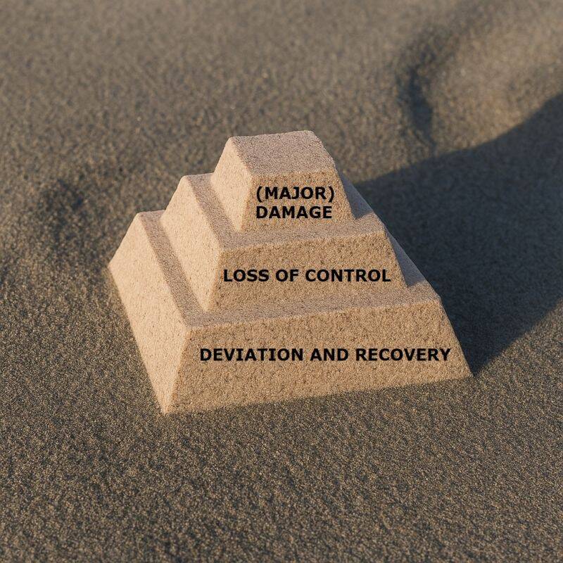 Hale conceptualized accidents as processes with multiple points for potential recovery. Not all deviations escalate into accidents, and not all minor incidents are precursors to major ones. Therefore, the focus should be on understanding specific accident scenarios, instead of comparing outcomes by severity. For this reason, Hale drew a step pyramid like the one in Djoser instead of the smooth pyramid of Khufu in Giza. See my simple reproduction above this piece.